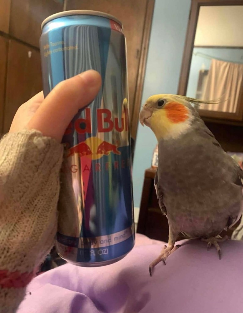 Moltres cannot go a day without begging for something that is bad for him. It seems like he just wants wings, but the ones he’d get are angel wings, birds should not be consuming caffeine! I see people posting giving their birds small sips of coffee, and I came on here to tell you that even in small amounts, caffeine can give birds arrythmias, heart attack and lead to death.